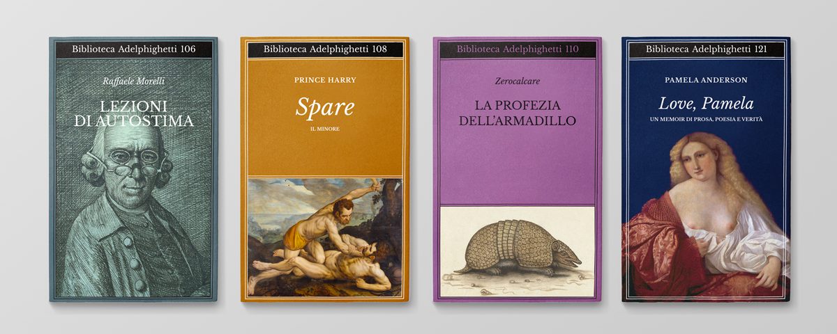 Per sua stessa definizione Adelphigetti è una casa editrice immaginaria, che pubblica sui social copertine mai esistite di libri reali, ispirandosi all’estetica della casa editrice Adelphi, ma anche a certe edizioni Einaudi e Mondadori, creando collegamenti inattesi. Love, Pamela – la copertina della recente autobiografia di Pamela Anderson – viene quindi re-immaginata come se appartenesse alla stessa collana “Biblioteca Adelphi” della Lolita di Vladimir Nabokov, con tanto di dettaglio di un ritratto opera di Palma il Vecchio in copertina. Lo stesso trattamento viene riservato alle Lezioni di autostima di Raffaele Morelli, o al recente caso letterario Stigma di Erin Doom: tutti provvisti di una nuova copertina, per nobilitarli, a un primo sguardo, ma anche per scherzare su certe idiosincrasie dei lettori e degli amanti dei libri, sfruttando le immagini delle opere d’arte di tutto il mondo.