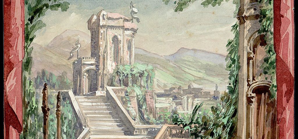 Immagine da Wikimedia Commons, Ricchi giardini nel Palazzo di Monforte a Palermo, bozzetto per I Vespri siciliani atto 5, Archivio storico Ricordi.