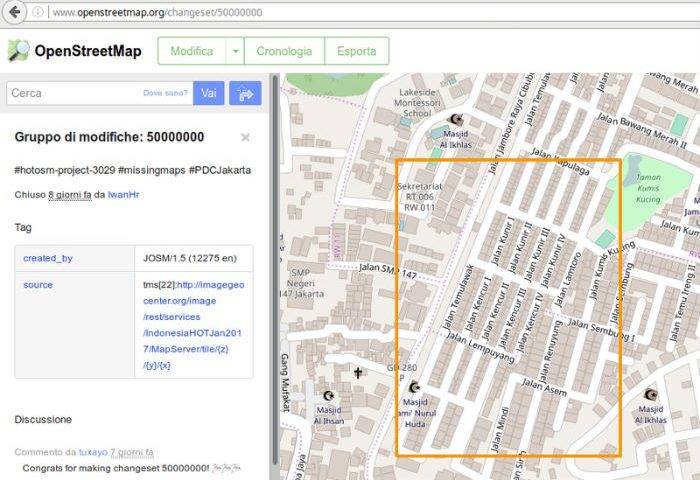 Il 50 milionesimo caricamento ha un valore simbolico oltre che numerico in quanto opera di un utente che stava collaborando a un progetto di Missing Maps in Indonesia, ossia a uno dei programmi nati con l’obiettivo di mappare preventivamente regioni particolarmente interessate dal rischio di disastri naturali, in mo do da disporre un buon supporto cartografico in caso di emergenze.