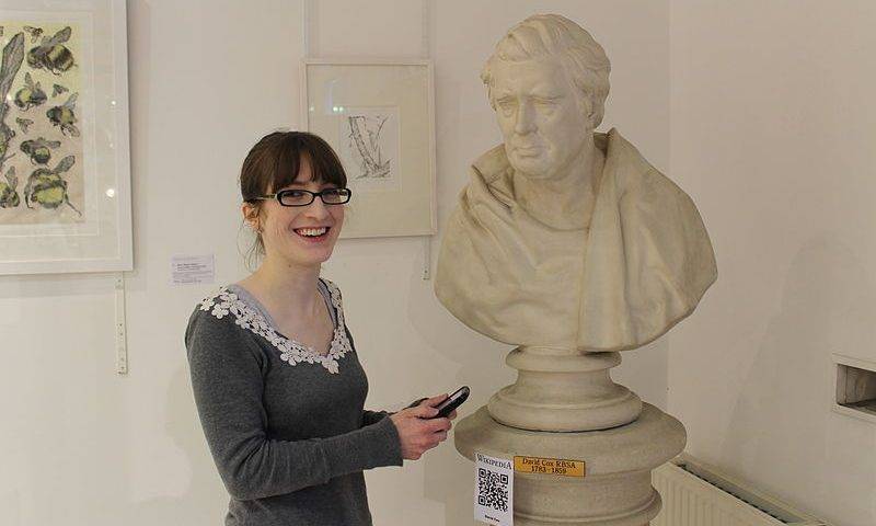 Nell’immagine: Una dipendente della Royal Birmingham Society of Artists (RBSA) esegue la scansione di uno dei codici QRpedia sul busto di David Cox. Foto di Rock drum (opera propria), CC BY-SA 3.0, via Wikimedia Commons