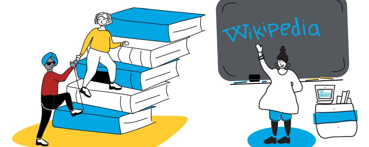 Immagine: Climbing up book stairs 2 – RWiC e Teacher Wikipedia blackboard – RWiC, di Mam’Gobozi Design Factory (MDF), CC BY-SA 4.0, da Wikimedia Commons