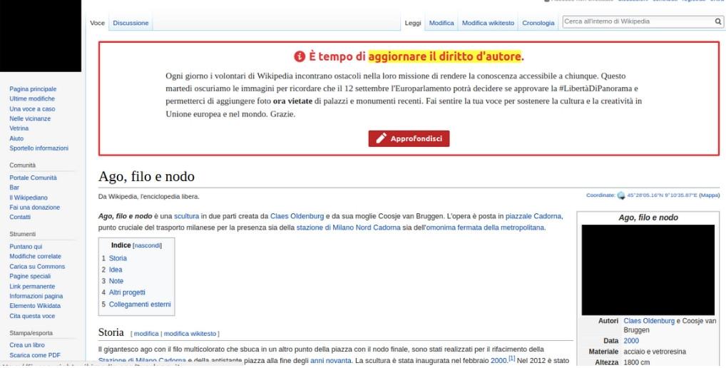 Nell’immagine: Grafica realizzata in occasione del voto in Parlamento europeo, CC BY-SA 4.0, via Wikimedia Commons. Nella foto l’opera “The Life electric” realizzata da Libeskind a Como e fotografata da Mm4mm per Wiki Loves Monuments 2017. Se in Italia ci fosse la libertà di panorama, questo monumento sarebbe liberamente fotografabile e pubblicabile su Wikimedia Commons, attualmente invece è necessaria un’autorizzazione per poterlo fare.