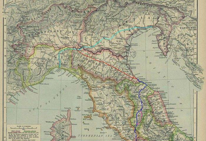 Nell’immagine: il sistema viario dell’antica Roma per la direttrice Nord-Est. in sequenza partendo da Roma: in rosso la via Aemilia che si collega alla via Postumia con arrivo ad Aquileia. Immagine di EH101 – GFDL/CC-BY-SA-3.0, via Wikimedia Commons