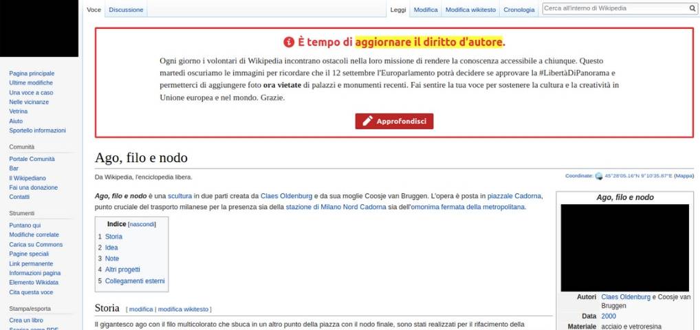 Per lanciare un ultimo appello per la libertà di panorama, la comunità di volontari attivi su Wikipedia in lingua italiana ha deciso oggi di “coprire” simbolicamente tutte le immagini presenti sulle voci dell’enciclopedia libera: ogni scatto è importante e ogni fotografia mancante è un’occasione persa per condividere il sapere, per questo ci serve la libertà di panorama!