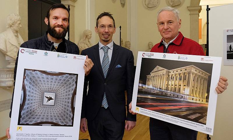 Nell’immagine: Sailko, Marco Chemello e Claudio Concina, rispettivamente il quinto classificato WLM 2018, il coordinatore WMI per il Veneto e il vincitore del premio Wiki Loves Veneto, mostrano le loro fotografie alla premiazione locale a Verona. Di Stefano Maurizio Venturini, CC BY-SA 4.0, via Wikimedia Commons