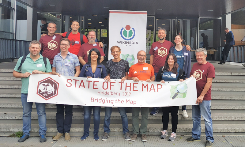 Nell’immagine: Foto di gruppo degli utenti OSM italiani a State of the Map 2019 Heidelberg. Di Mbranco2, CC BY-SA 4.0, via Wikimedia Commons